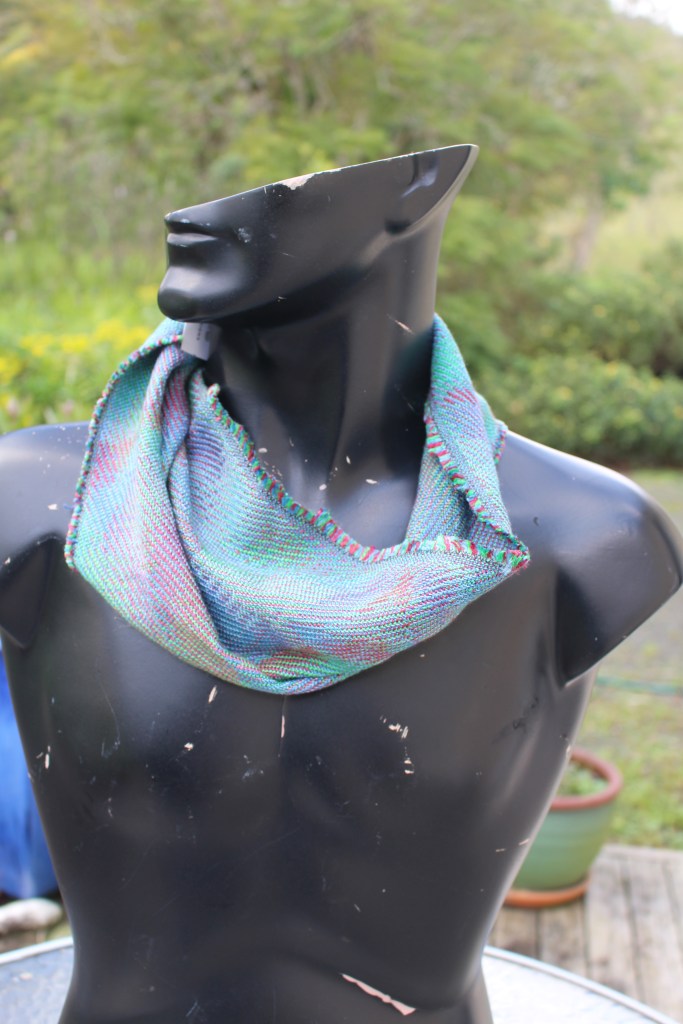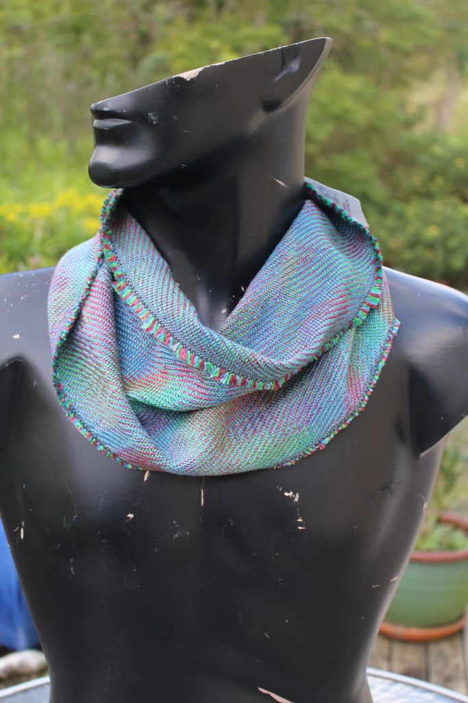 This cowl which is sewn with a twist is woven with hand dyed silk yarn in warp and weft.