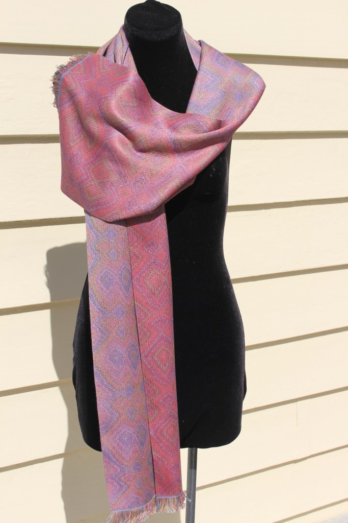Very fine silk scarf that shows a multitude of colour combination due to the fact that there is 3 different colours in the warp and two different colours in the weft so back and front of the scarf show a differernt colour intensity