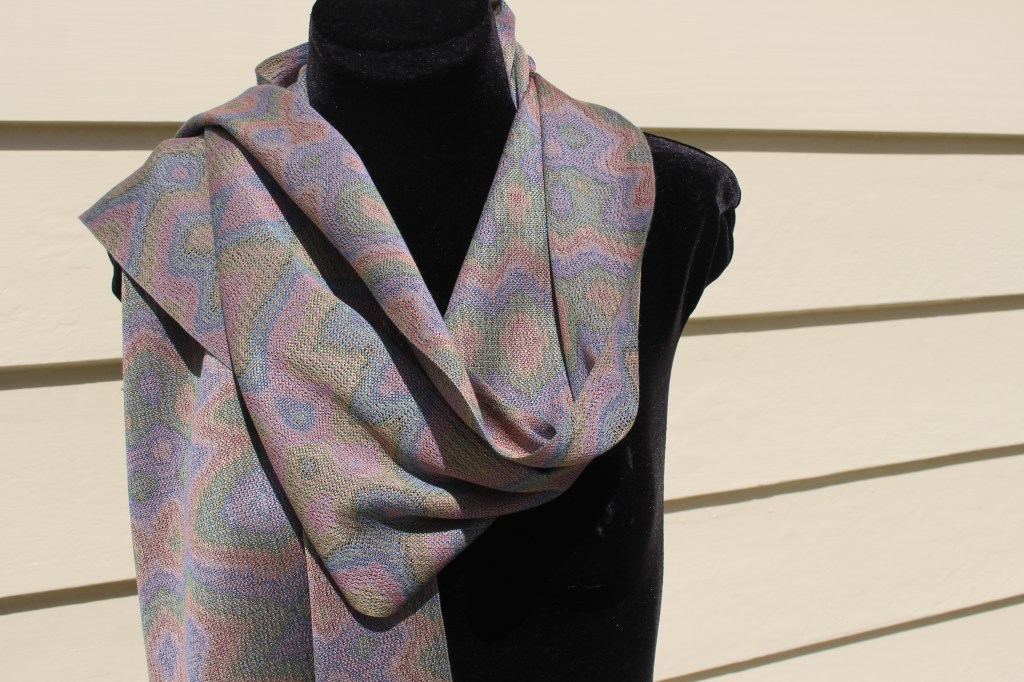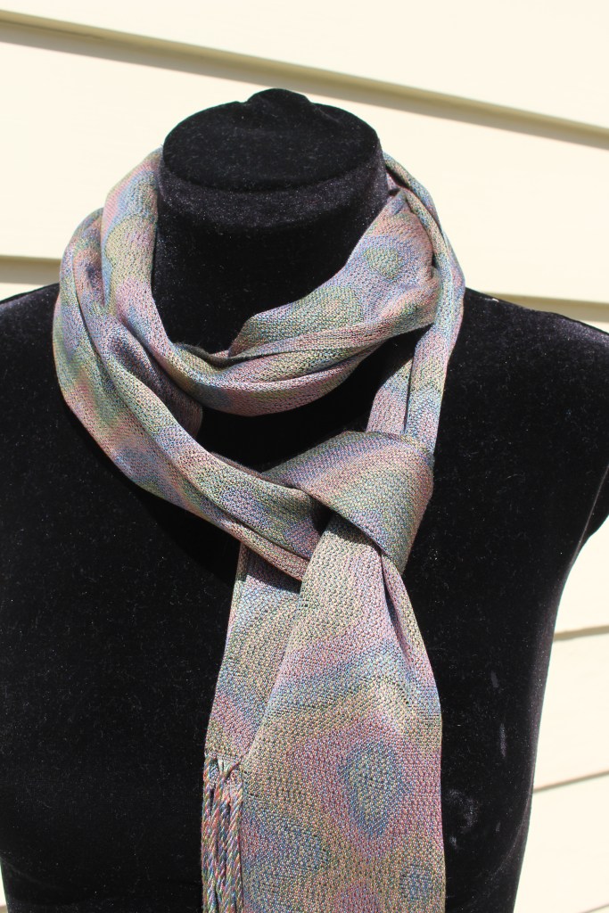 Fine silk scarf showing a multitude of colours blending due to choice of warp and weft colours as well as weaving technique