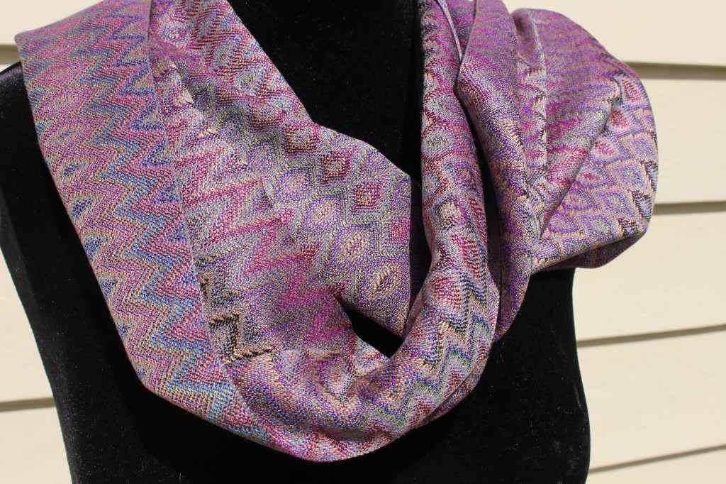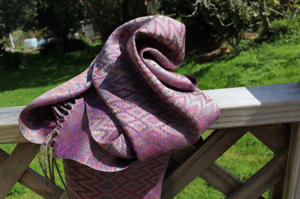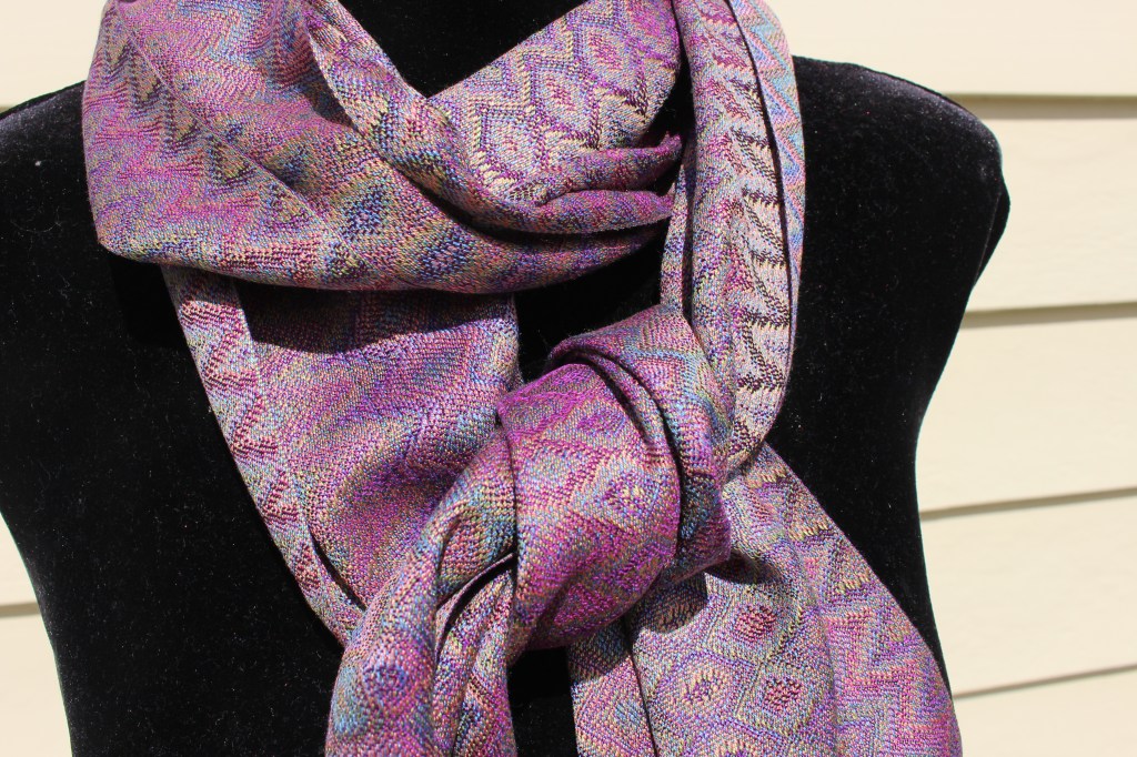 Very fine Silk scarf woven as a 3 Echo weave, meaning there is three colours in the warp, a blue, felt green and a salmon. The weft in this piece is super fine Organzine Silk in a purple colour used doubled and the result is a scarf with an amazing iridescence.