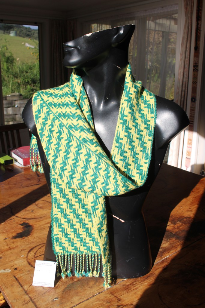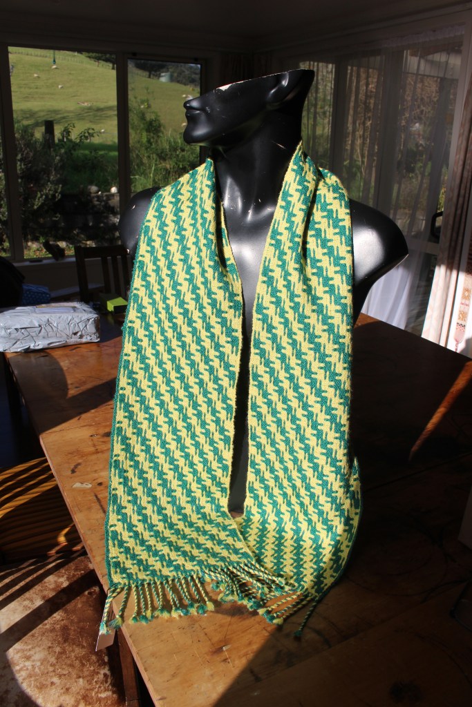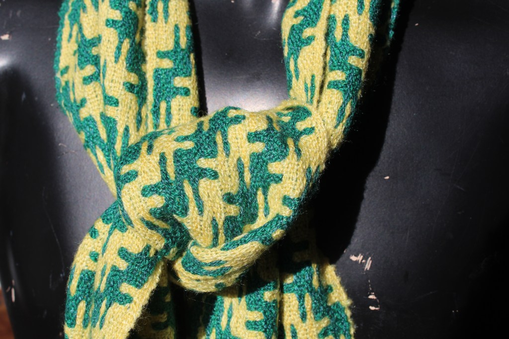 Scarf using a blend of 50% Merino wool and 50% Tussah Silk, woven in a technique which is knows as Deflected Doubleweave. This is not Doubleweave as such but once the weaving is off the loom and has been wetfinished the threads deflect into each other creating different patterns from what it looked like on the loom. Usually the front and back side look quite different from each other.