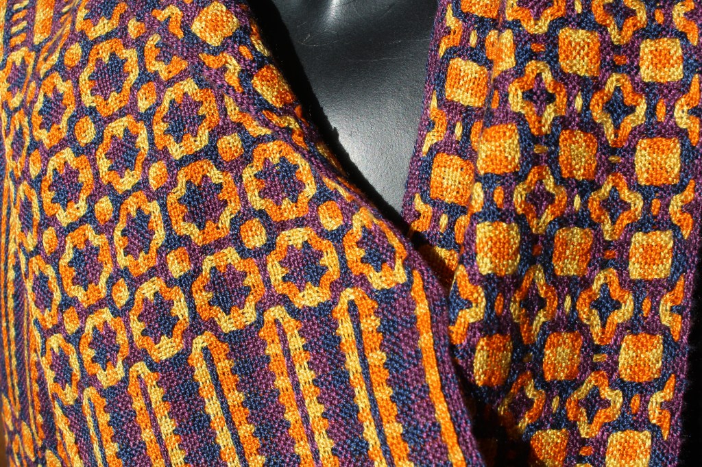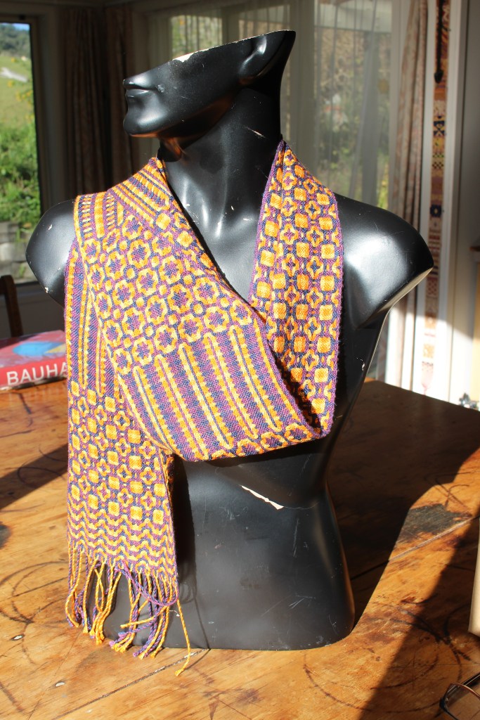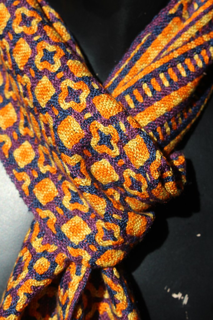 100% Silk Scarf using a technique which is knows as Deflected Doubleweave. This is not Doubleweave as such but once the weaving is off the loom and has been wetfinished the threads deflect into each other creating different patterns from what it looked like on the loom. Usually the front and back side look quite different from each other.