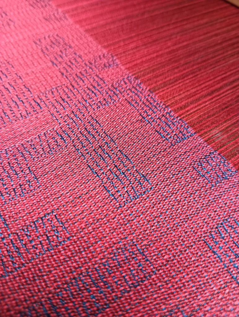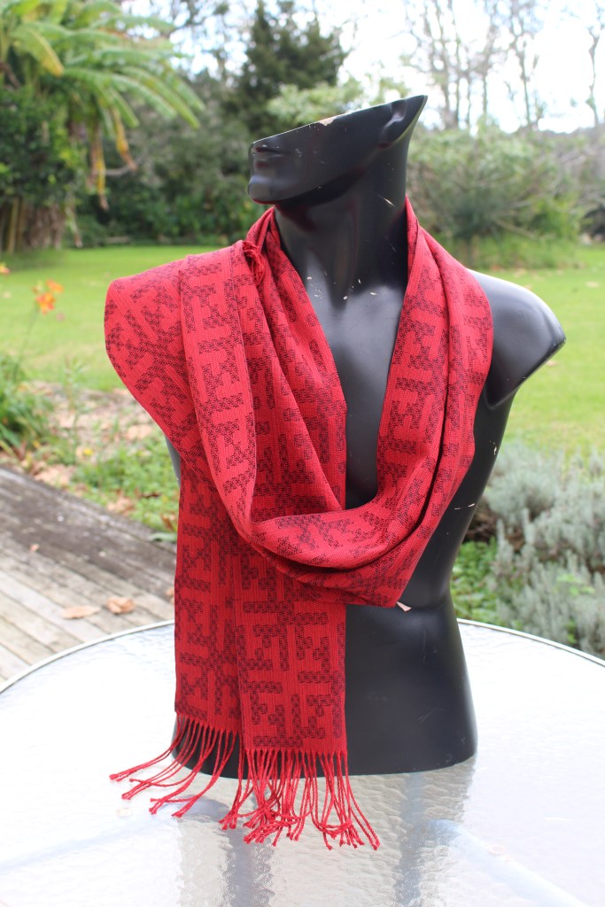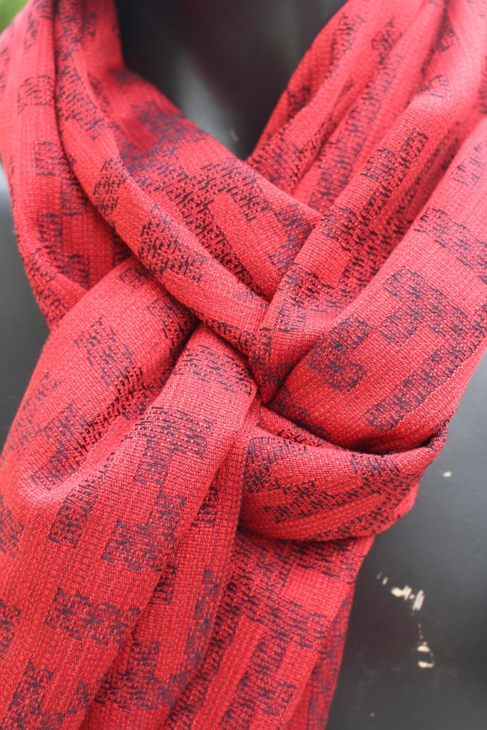 Fine silk scarf using a design which is called Fractals. Close up one can see that the pattern within the pattern is the same, just very much smaller. This was made using a warp of 4 different reds which are threaded in no particular order and gives it a lively effect. The weft is superfine silk weft in a dark navy colour.