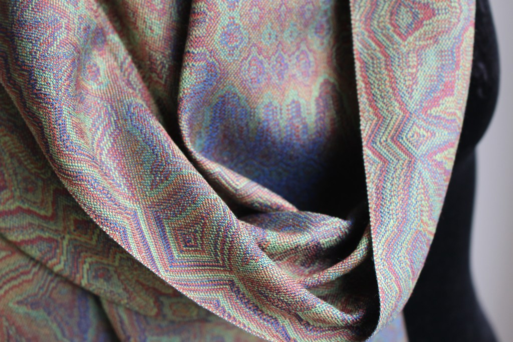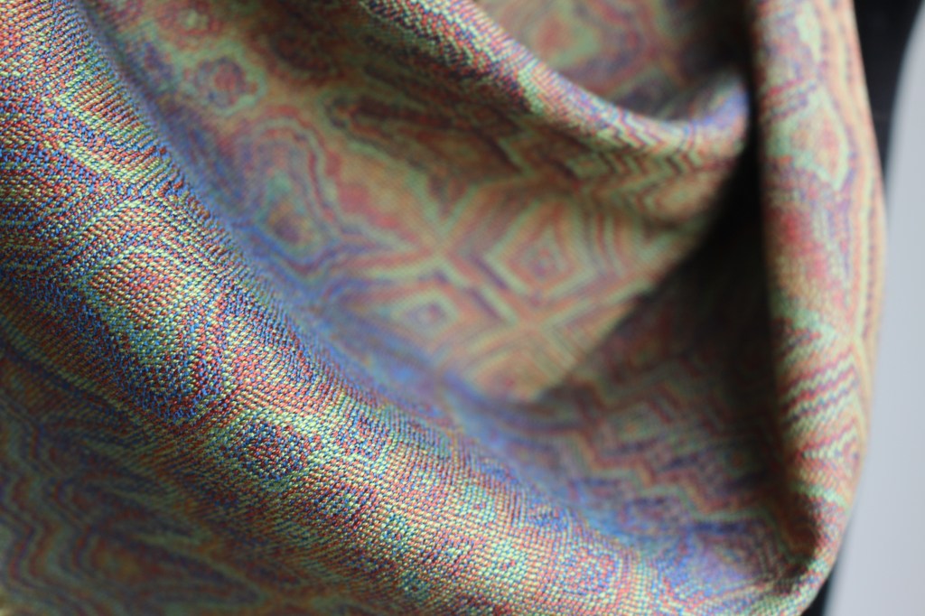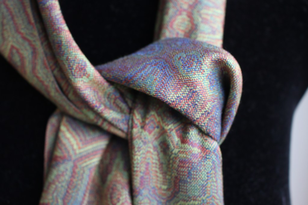 This 100 % fine silk scarf shows a multitude of colour variations depending from what angle one looks at it. Also has got the most amazing iridescence, sometimes one sees more of the warp colours and other times more of the weft colour.