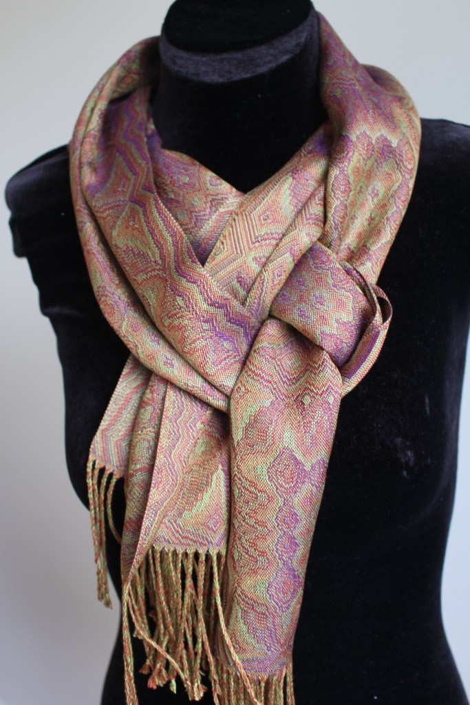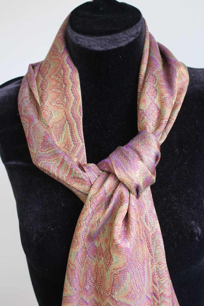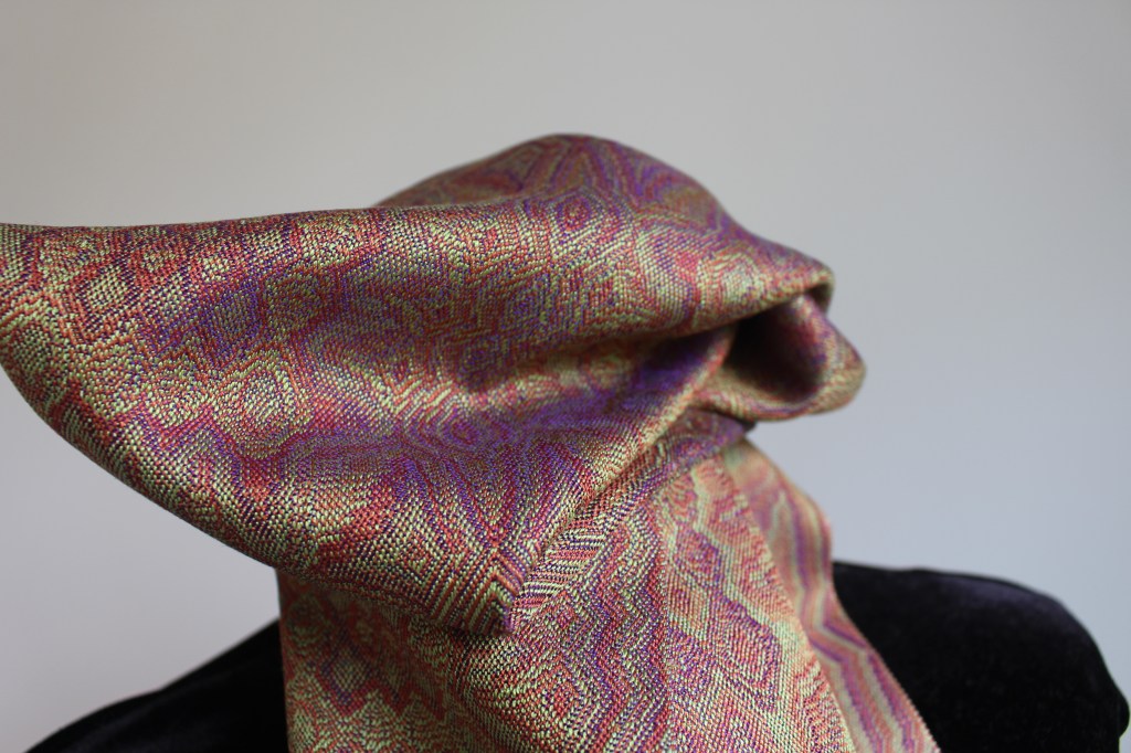 This 100 % fine silk scarf shows a multitude of colour variations depending from what angle one looks at it. The choice of a dark purple very fine silk for weft makes the colours sing. Also has got the most amazing iridescence, sometimes one sees more of the warp colours and other times more of the weft colour.