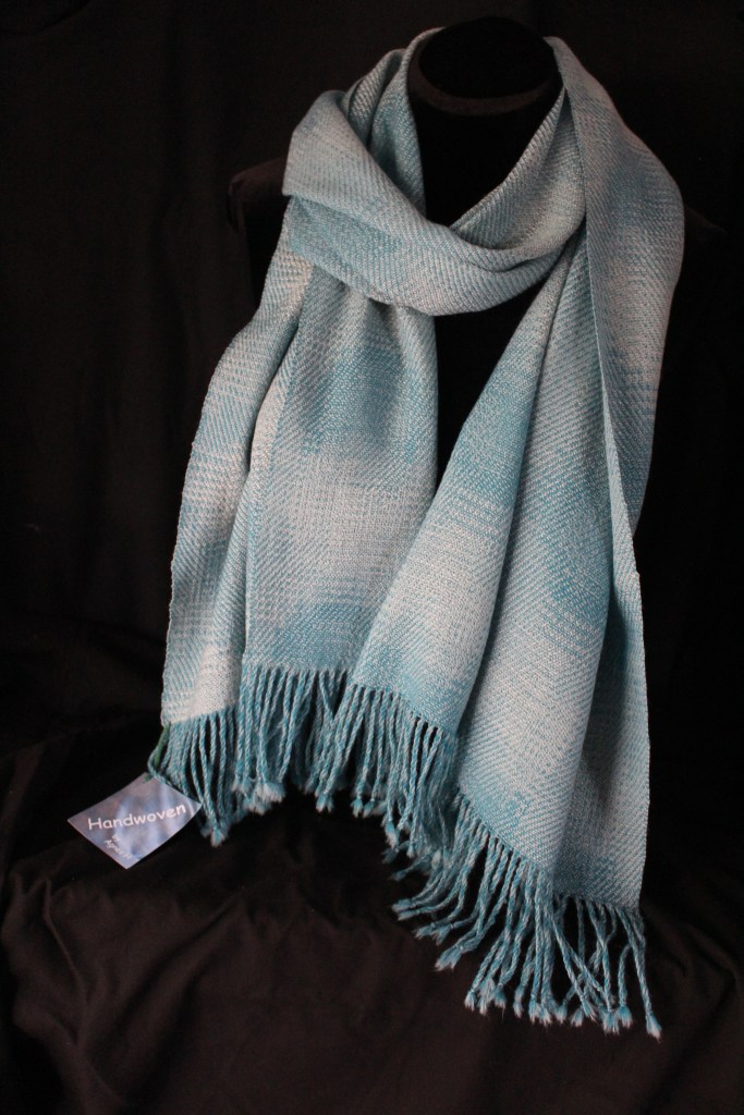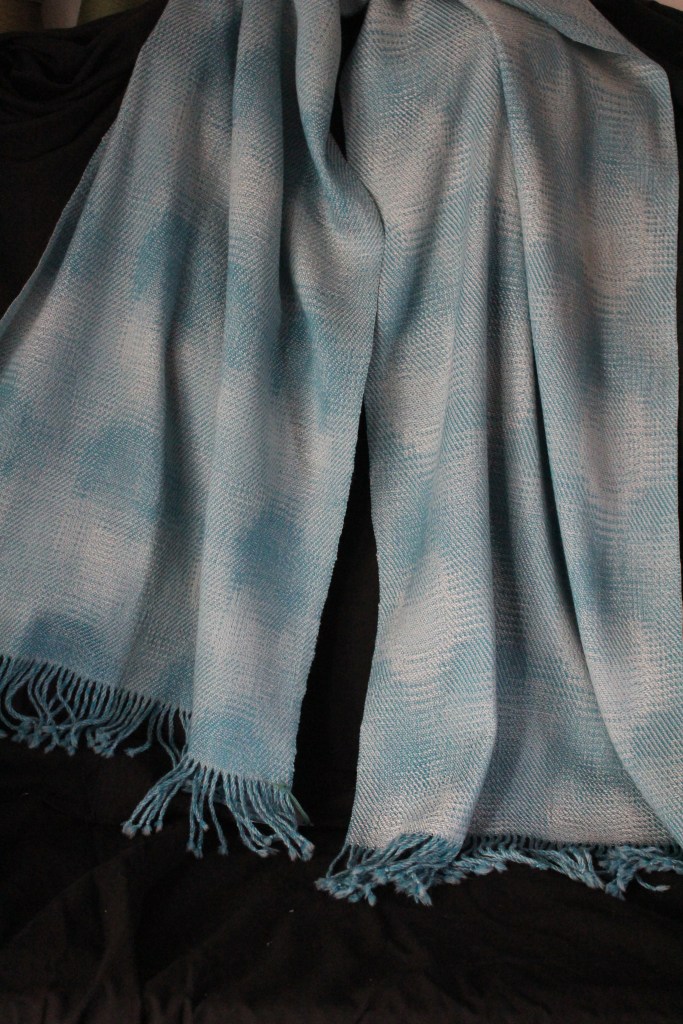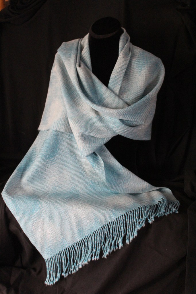 This shawl gives the impression of a beautiful light blue sky interspersed with soft clouds.
