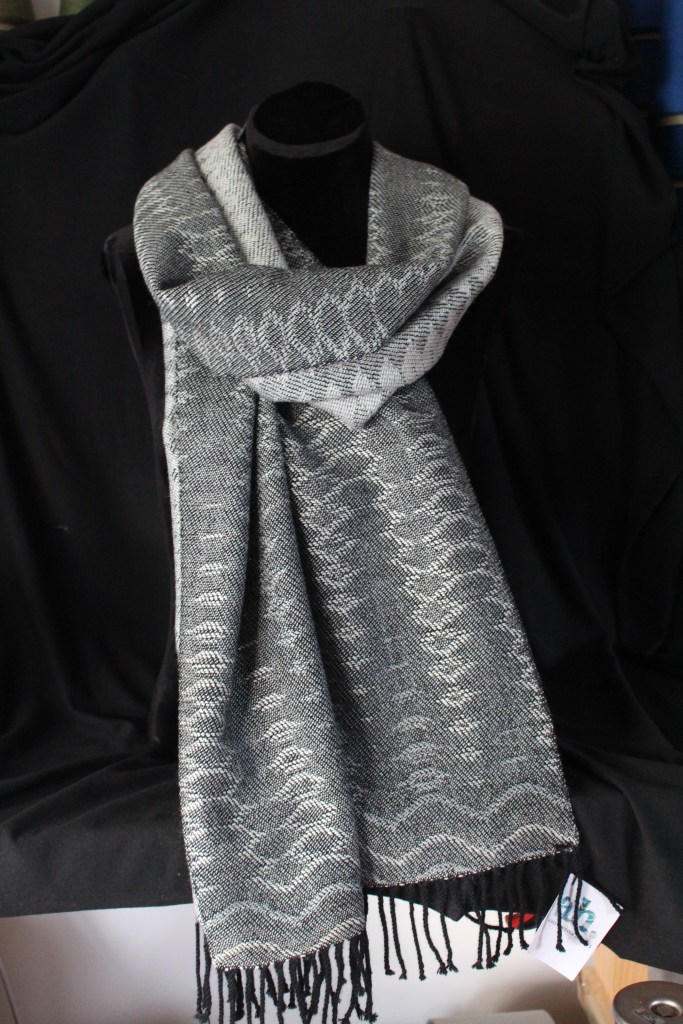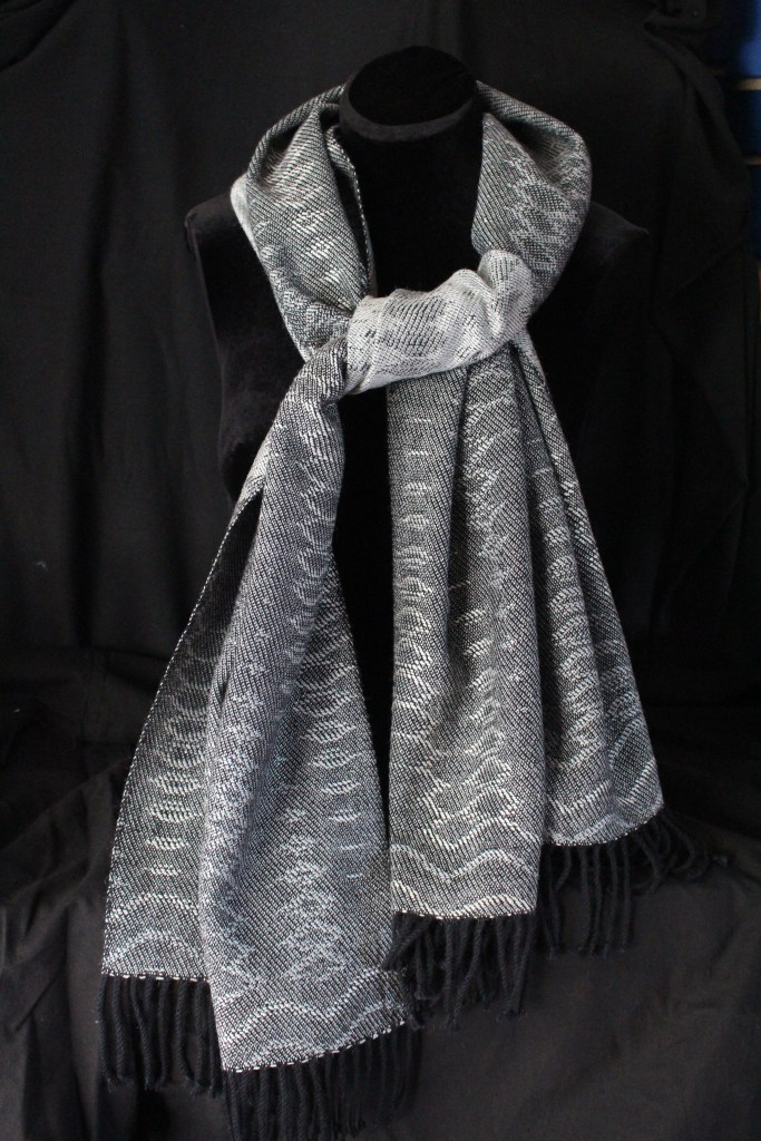 Shawl that can easily also be worn as a chunky scarf is made of Possum/Merino/Silk blended yarn in the warp and a lovely Tussah Silk in the weft. Wonderful drape and soft to the touch