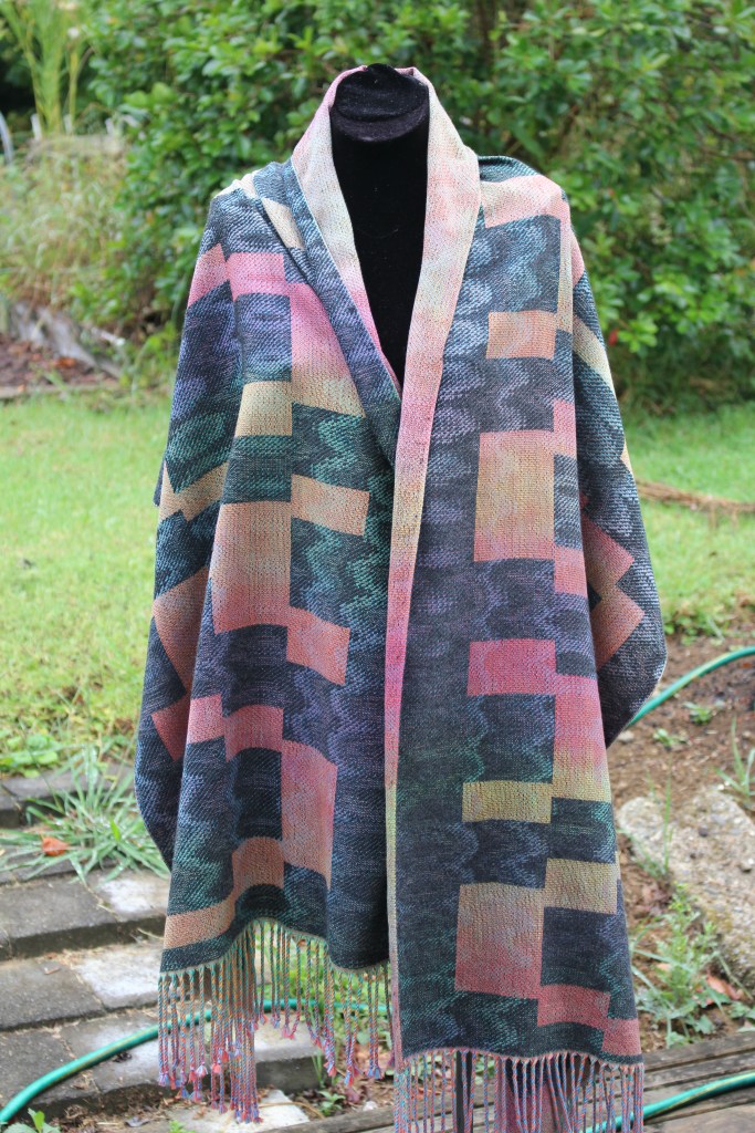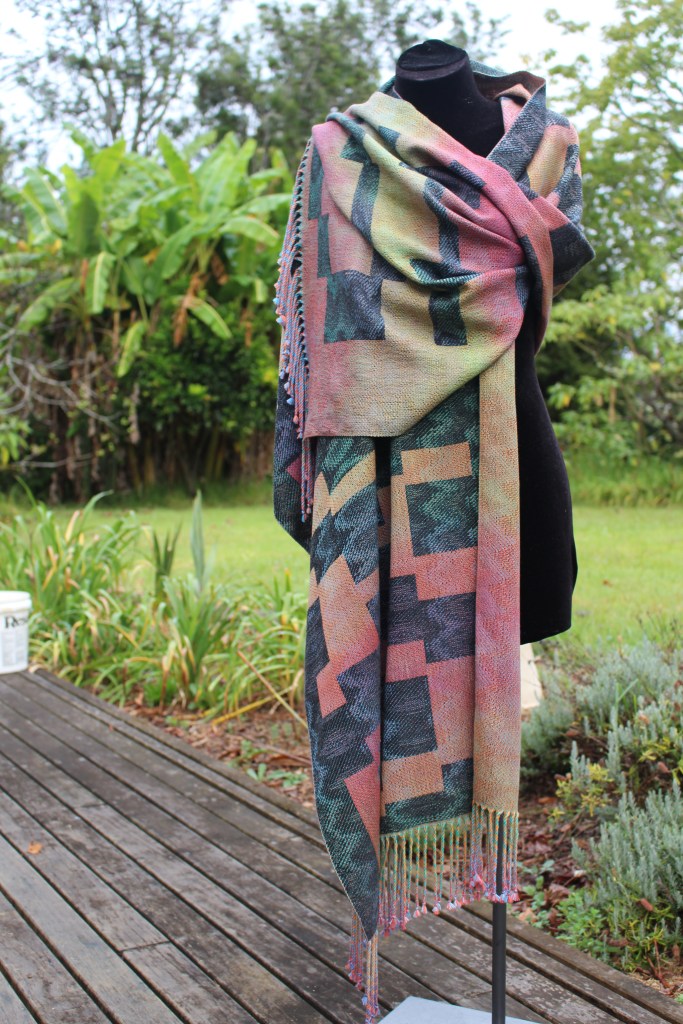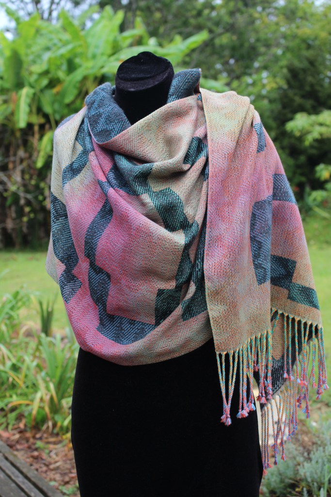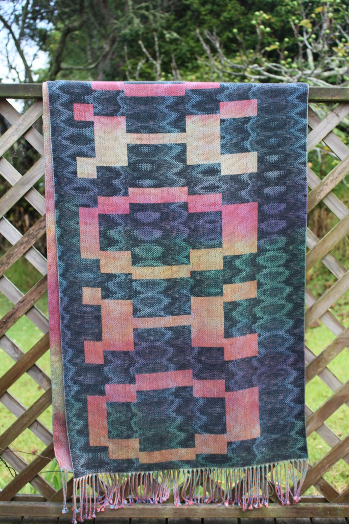 This beautiful shawls is a warp of hand painted Sea Island Cotton in two colour ways to create the effect of having a curved design combined with a block design all in one piece. For wefts I used a Cashmere/Silk Blend for the pattern pick and a super fine Silk for the tabby pick